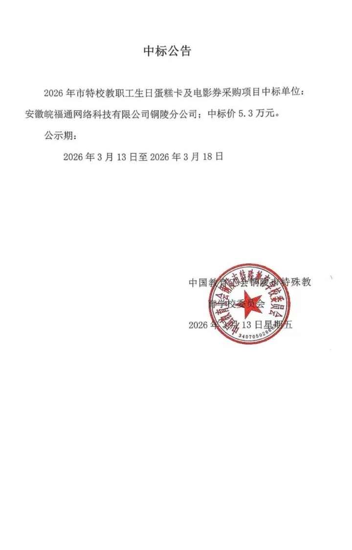 铜陵市特殊教育学校工会委员会对2026年教职工生日蛋糕卡及电影券采购项目询价公告
