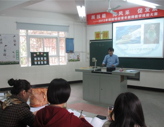 为了贯彻落实《铜陵市教育质量提升年实施方案》的精神,为青年教师搭建一个锻炼自己和展示风采的平台,4月19日下午,铜陵特校 “展技能、亮风采、促发展”青年教师教学技能大赛拉开了帷幕。全校11位35周岁以下的青年教师全部参加这次活动。比赛的内容分为通用技能和专业技能两部分,分别于4月19日和4月21日两天举行。大赛采用现场抽题,现场完成的比赛方式。大赛共设7位评委,分别来自市教育局教研室 、马鞍山特校、铜陵特校。