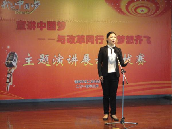 3月21日上午,市总工会举办了“宣讲中国梦——与改革同行,与梦想齐飞”的主题宣讲展示赛,沃先桃老师演讲的《让梦想展翅飞翔》获一等奖,讲述了我校老师们的心中梦想和助推教育改革发展的事迹与感悟,展示了工人阶级的主力军作用和主人翁风采。