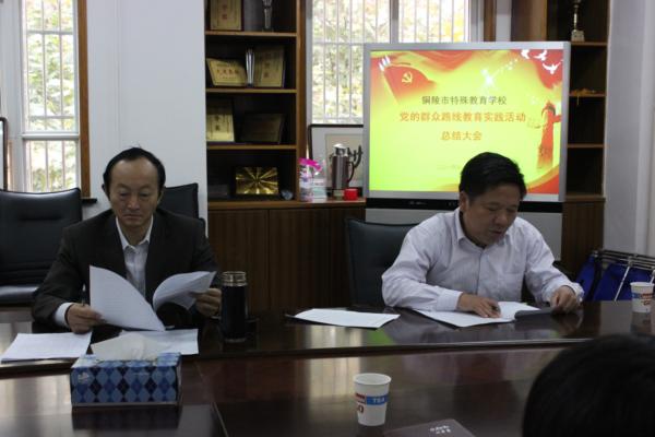 2014年10月16日下午,市特校召开党的群众路线教育实践活动总结大会,特校校长、党支部书记作总结报告,局党委委员、纪委书记张梁同志出席会议并讲话。参加此次会议的还有特校班子成员、全体党员及部分家长的代表。