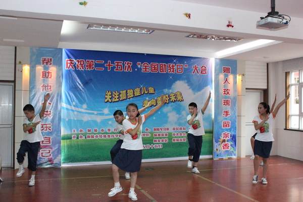 5月15日,市特校举办了热情洋溢的助残日活动,其中听障五年级6位同学表演的舞蹈《小苹果》活泼可爱、富有时代精神和蓬勃朝气,反映了残障学生愉快的校园生活,后被市残联领导选入全市助残日文艺汇演之中。
