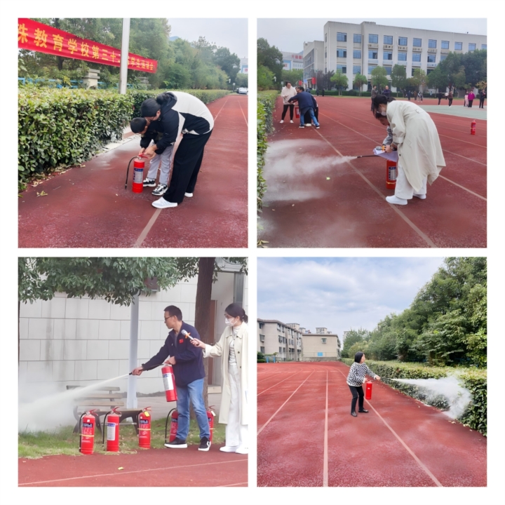 随后,总务处主任张召虎现场演示灭火器使用方法,详细讲解检查流程、拔插销、对准火源喷射等关键步骤,选定的师生代表进行实际操作演练。