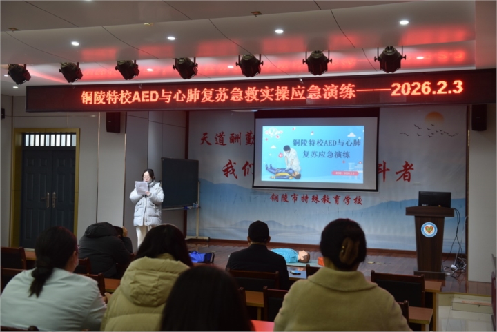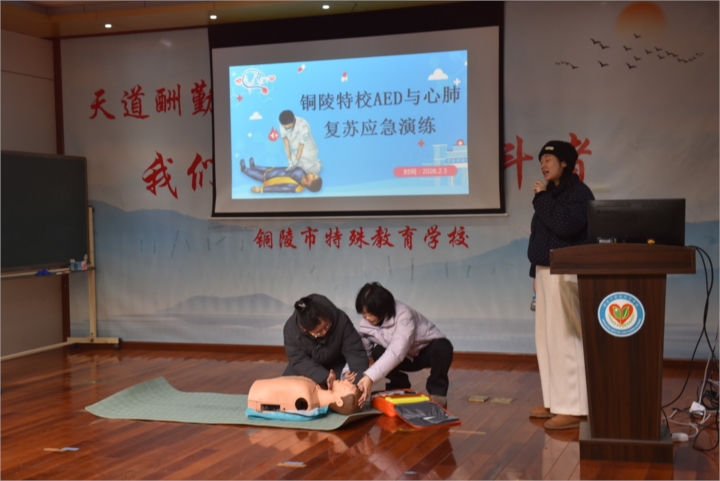 为提升教职工应对校园突发急救事件的处置能力,筑牢校园安全防线,2月3日上午,铜陵特校组织全体教职工开展了“AED与心肺复苏专项应急演练”。