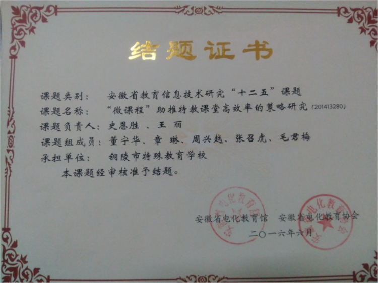 2016年6月15日,铜陵市特教学校收到了安徽省电教馆、安徽省电化教育协会颁发的课题《结题证书》,该校课题组史恩胜等七位老师历经三年精心研究的信息技术课题《“微课程”助推特教课堂高效率的策略研究》终于画上了圆满的句号。之前,课题组按照省馆要求,对研究工作进行了梳理、提炼和总结,提供了近6万字的结题评审材料。研究成果中,有5篇论文在省、市级刊物发表,12项信息技术课例、微课、课件、论文、随笔、教学设计等获全国、省、市大奖。严谨的态度、扎实的作风和丰硕的成果是该课题成功结题的关键。