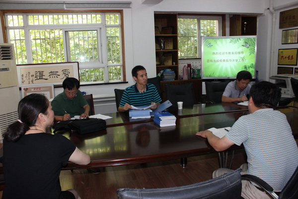 曹厚平校长向检查组的领导汇报学校开学工作及新校区建设工作,检查组随后查看学校开学台账,实地查看校园环境和设施设备并及时反馈交流。