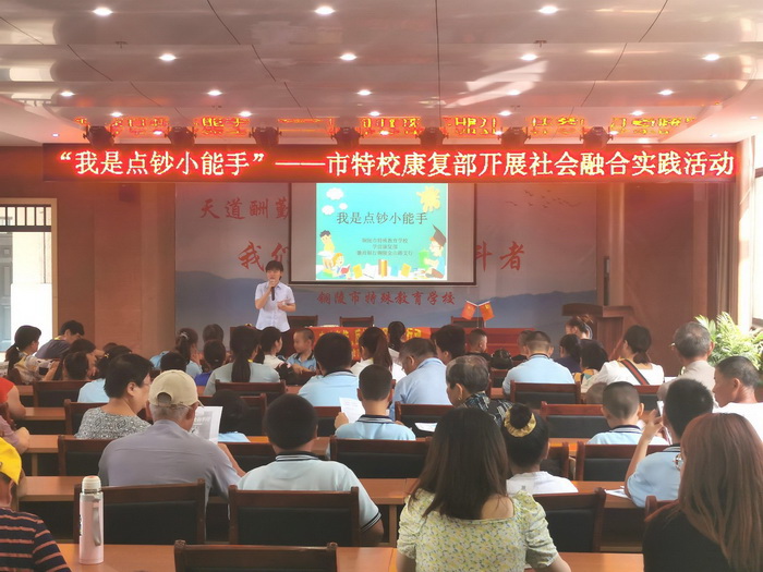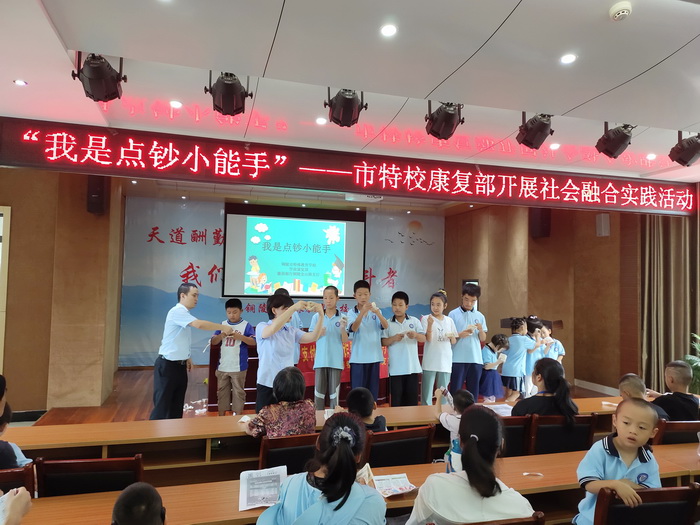 “生活即教育,社会即学校”为了把丰富的社会资源转变成为生动的教育活动课堂,9月24日上午,徽商银行铜陵市金山路支行的银行职员受邀来到铜陵市特殊教育学校康复部,带领同学们开展了“我是点钞小能手”的社会融合实践活动。