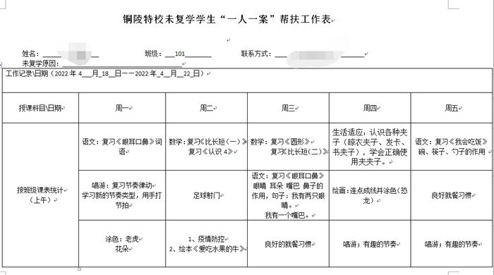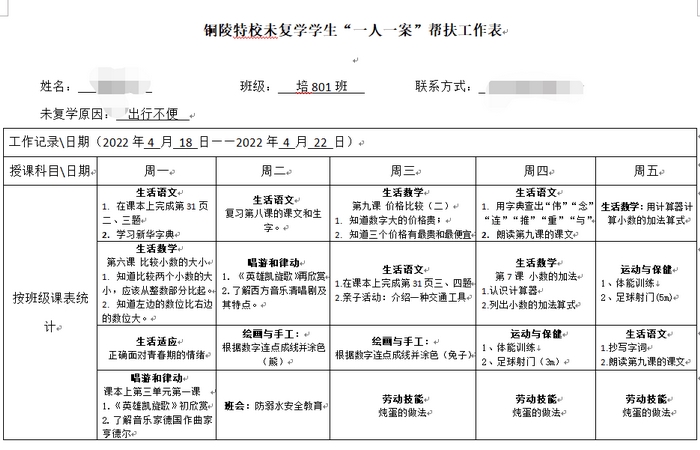 该校通过详细摸排,登记了11位学生不能返校的原因,并及时制定了“一人一案”进行帮扶辅导。学校以班主任为枢纽统计当天该生所在班级课程教学内容,并统一转达给学生,保障学生基本跟上各学科教学进度。待学生返校后,学校将组织学科带头人和骨干教师利用课后服务时间,开展补偿教学,确保每一名学生进一步跟上班级各学科学习进度。