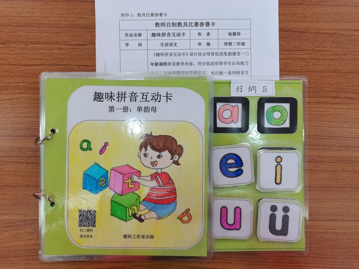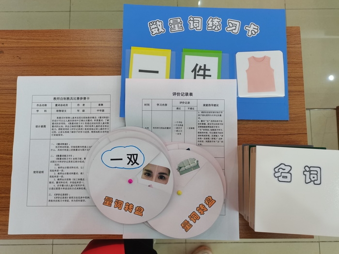 本次比赛共收到38件作品,内容涉及语文、数学、音乐、美术、运动、康复等学科。各教师依据现任教学科教学目标进行作品创作,体现目的性、趣味性、可操作性、生活性等特点,做到自制、安全、美观、创新、实用的要求。经过教师们的精心准备与大胆创新,各具特色的教具呈现在了评委们的眼前,制作教具的材料大多是常见的废旧材料,到了教师们的手中,它们便重获了存在的价值。总体作品体现着教师投入思考的积极态度和巧妙智慧,有的可以撕贴,有的可以抽拉,有的可以旋转,操作方法简单易行但却生动形象。