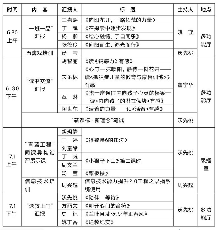 为掌握特殊教育新课程理念和现代教育理论,树立终身学习观念,以转变教师教育教学观念为前提,以提高教师的职业道德素质和教育教学水平为中心,建造一支结构优化、富有活力、勇于创新的优秀教师队伍,6月30日和7月1日铜陵特校开展了为期两天的暑假教师校本培训活动。