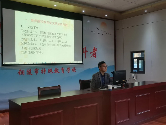 教育教学论文写作是教师的专业基本功之一,为进一步提高教师撰写论文的水平,促进教师队伍的发展,10月17日下午,铜陵特校开展了由市教科所刘志胜老师主讲的论文撰写专题培训活动。在业务校长陶世东的主持下,全校教师参与了此次论文专题培训活动。